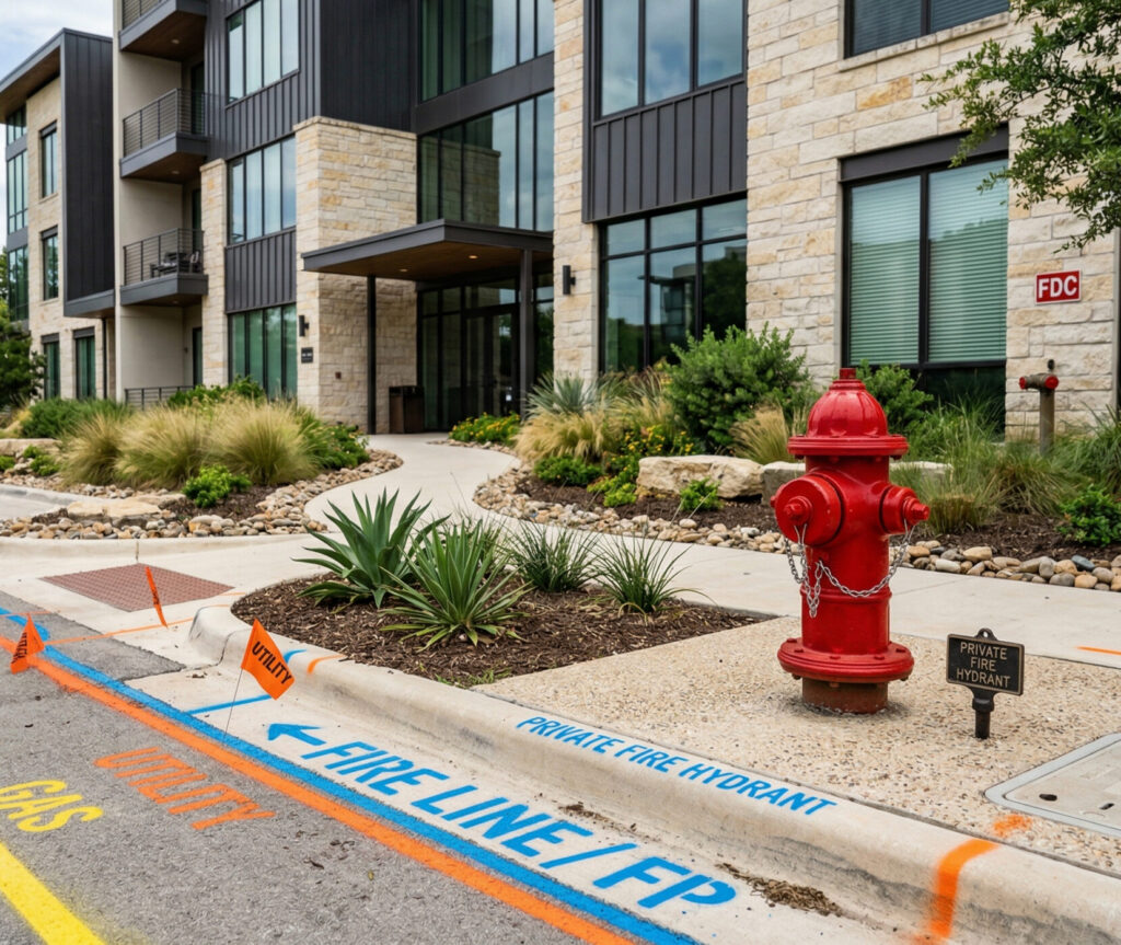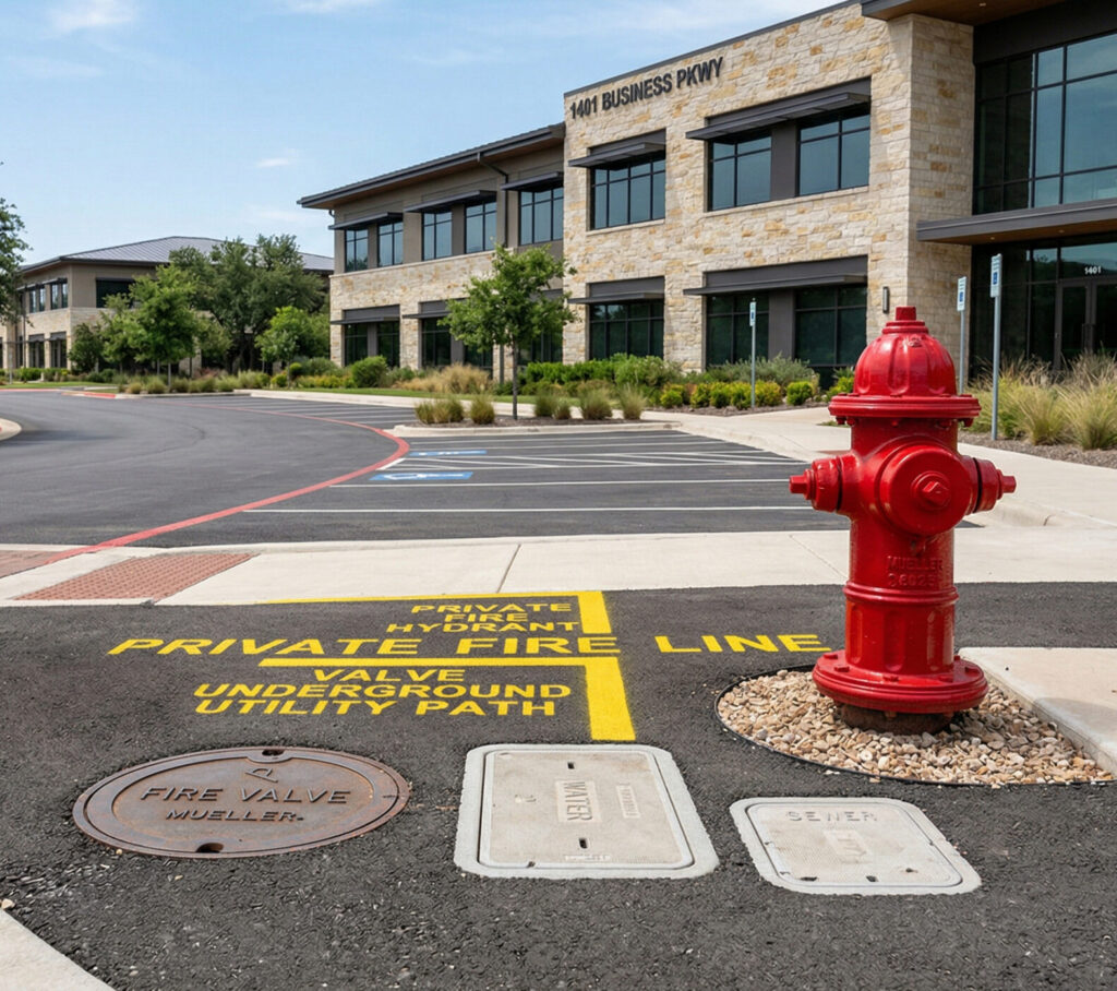An underground fire line is private underground piping that helps supply water for fire protection infrastructure on a property. Depending on the site, this may involve underground fire mains, hydrant leads, and related piping connected to private fire protection systems.